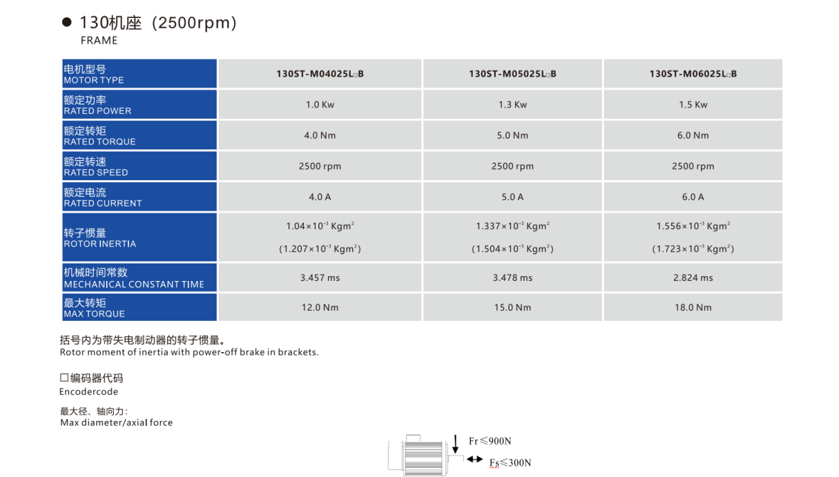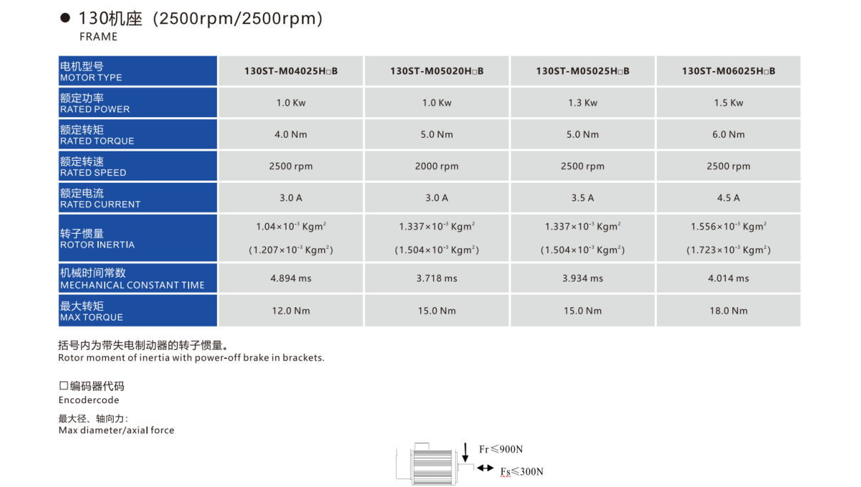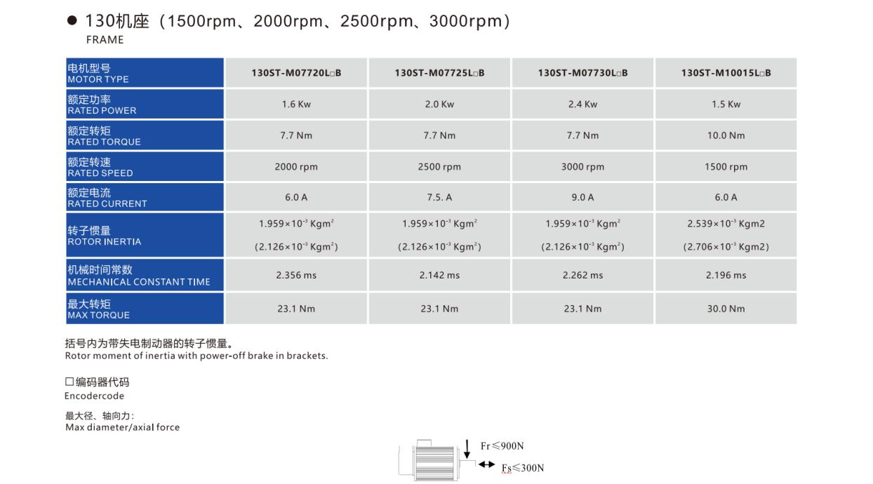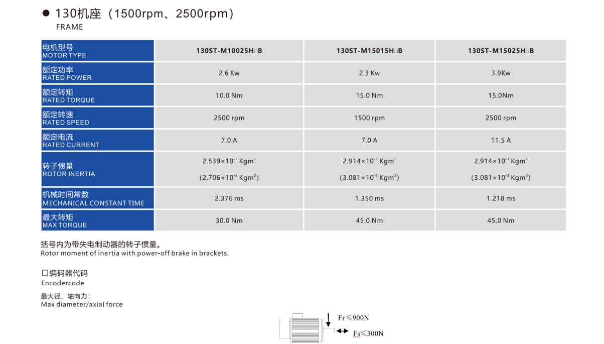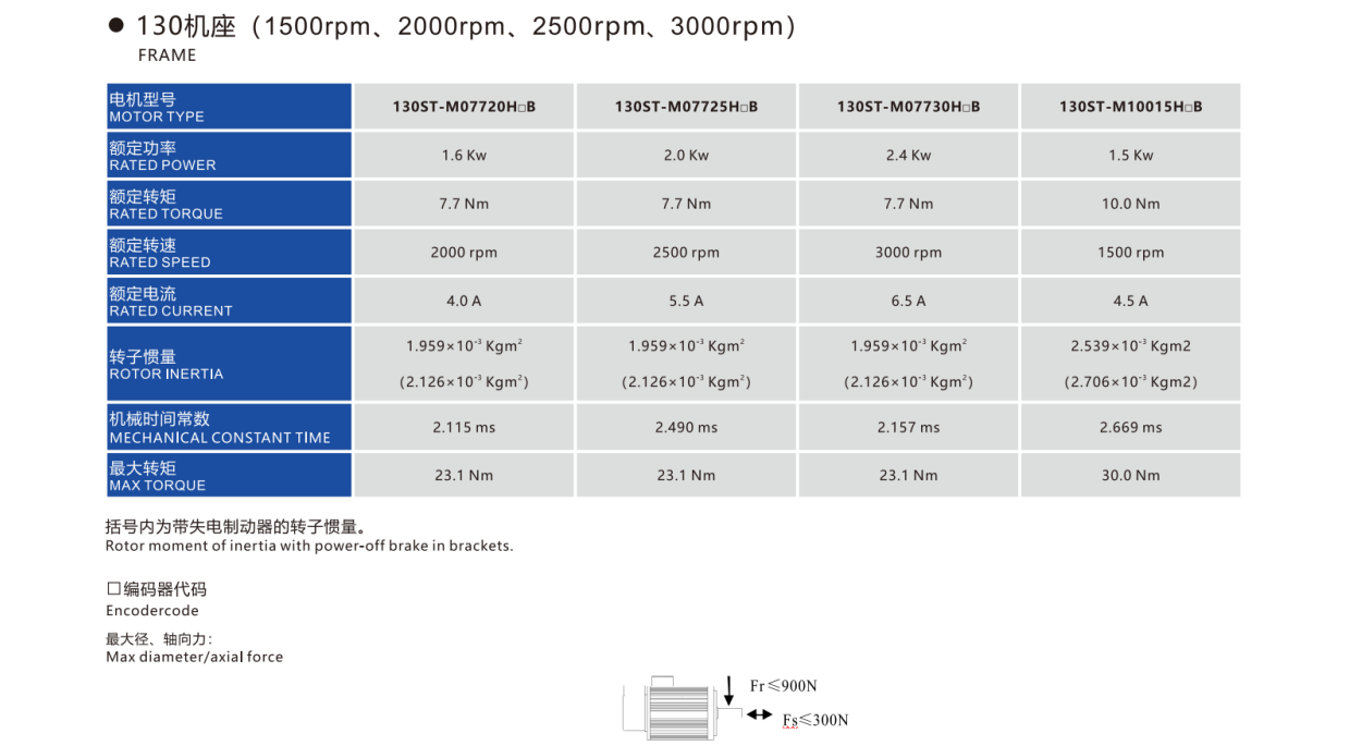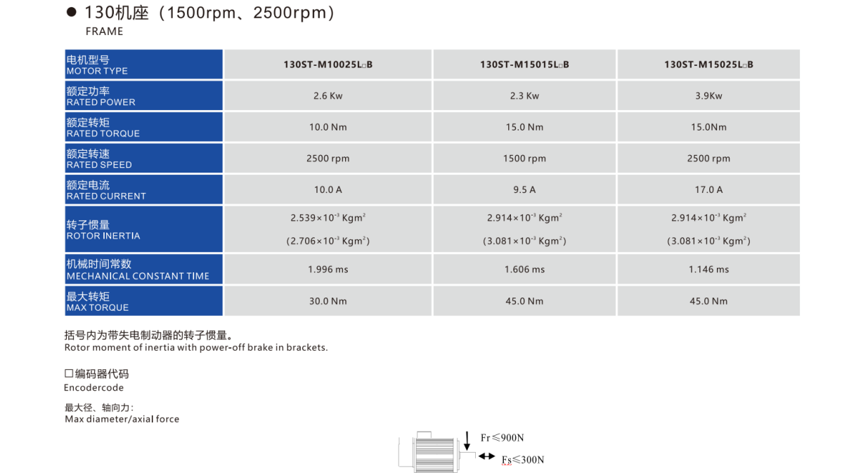HXDWH LB Series Motor Configuration 220V&380V Frame Sizes: 110ST, 130ST, 150STA 2-27Nm 0.6-5.5kw Rated speed:1500/2000/2500/3000rpm F: INCREMENTAL ENCODER(2500C/T) M1:TAMAGAWA ABSOLUTE ENCODER(23bit/39bit)