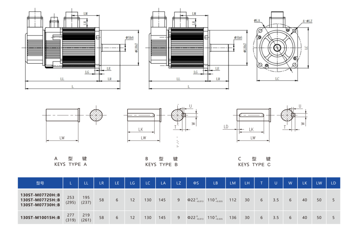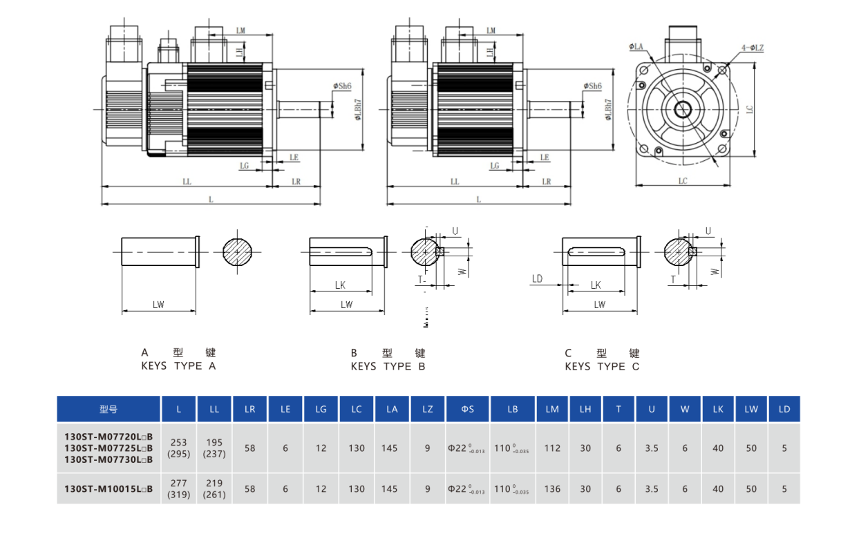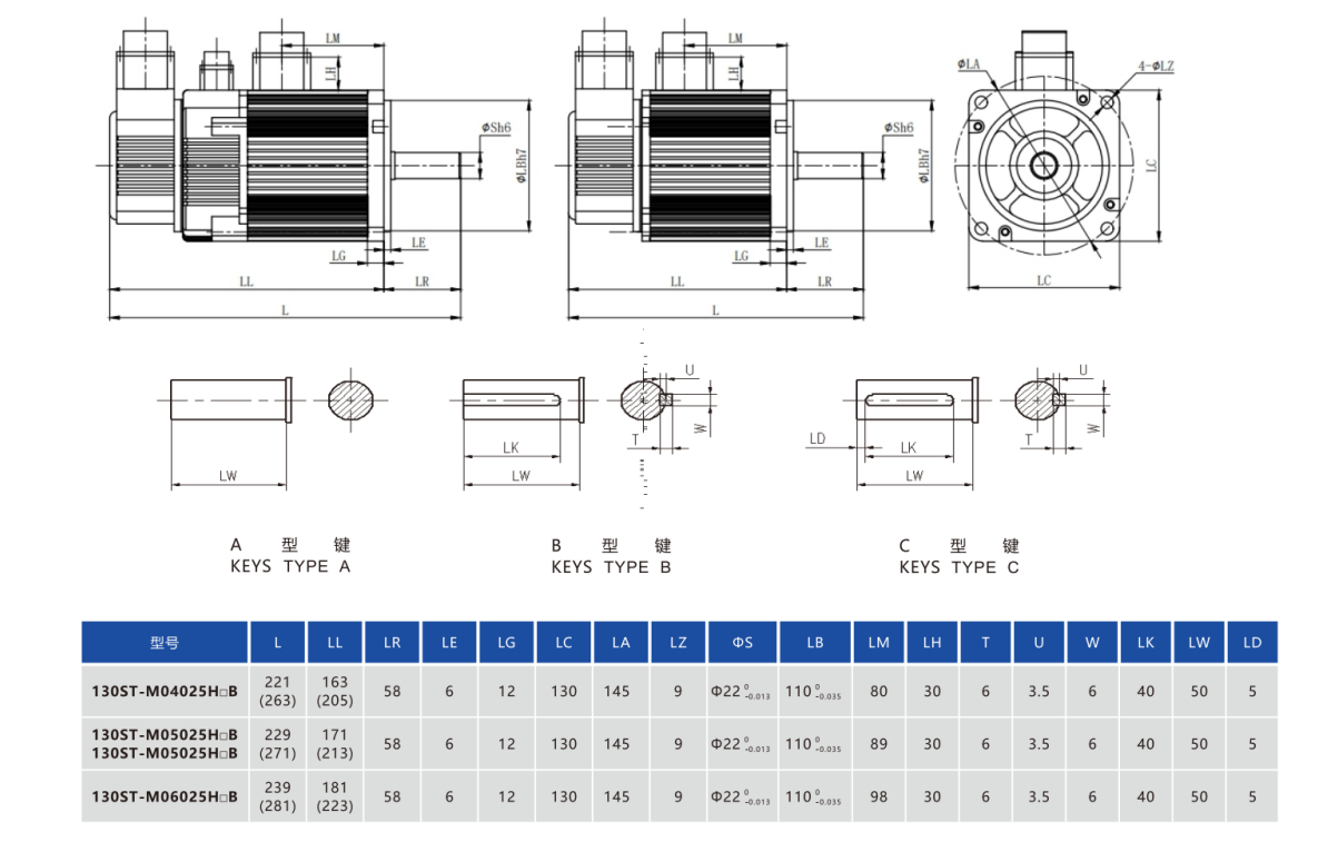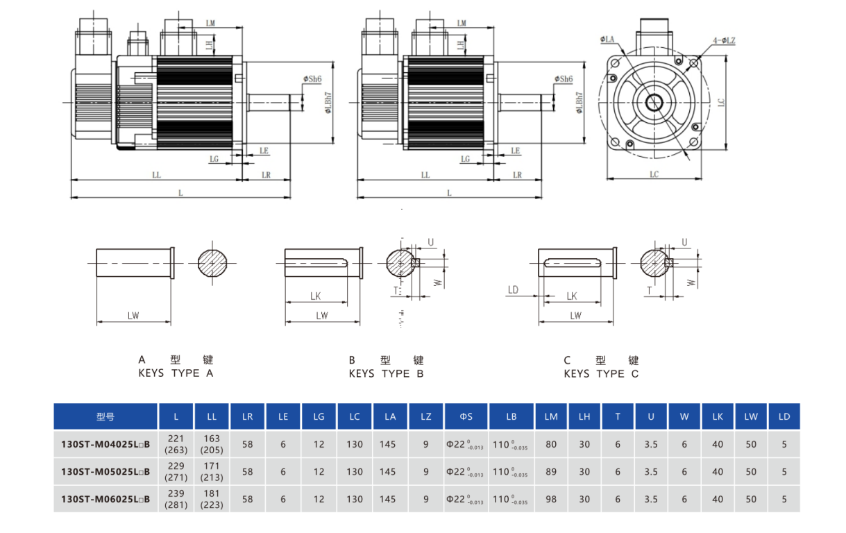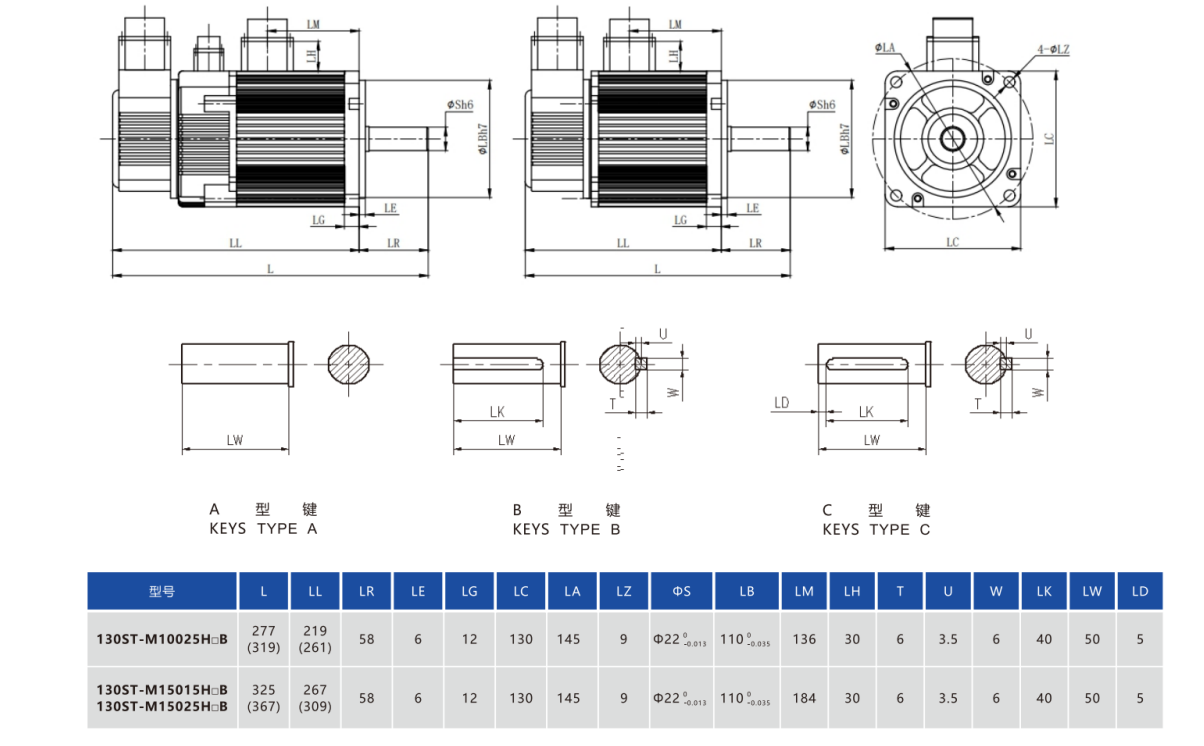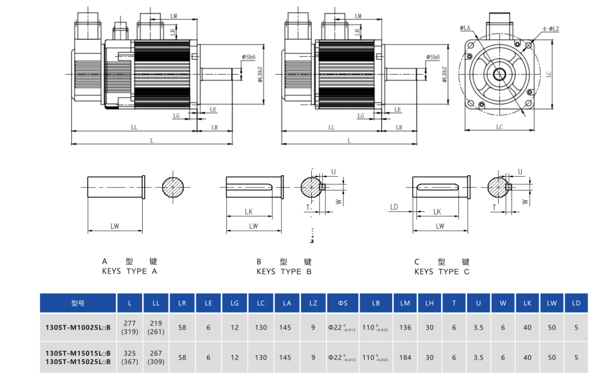 HXDWH LB Series Motor Configuration 220V&380V Frame Sizes: 110ST, 130ST, 150STA 2-27Nm 0.6-5.5kw Rated speed:1500/2000/2500/3000rpm F: INCREMENTAL ENCODER(2500C/T) M1:TAMAGAWA ABSOLUTE ENCODER(23bit/39bit)