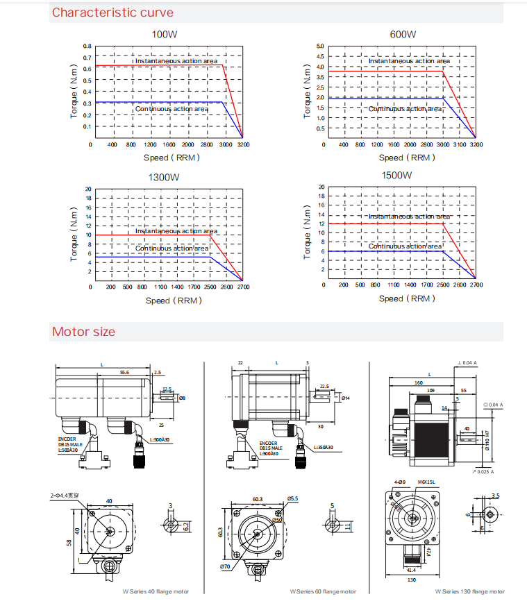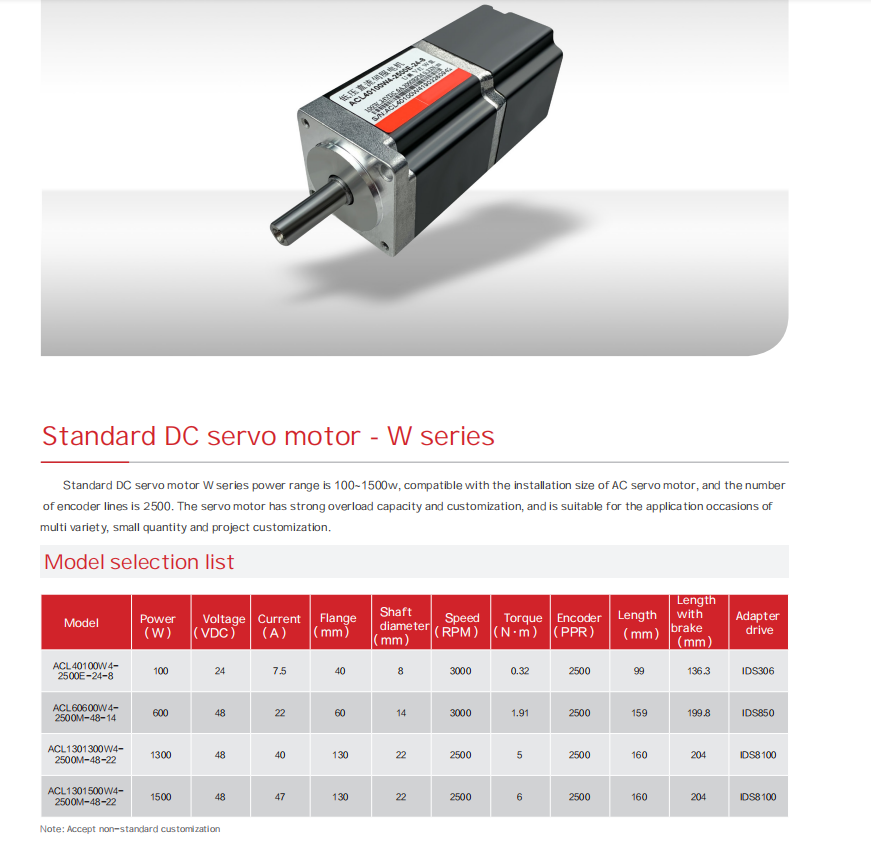 3、Standard DC servo motor W series power range is 100~1500w, compatible with the installation size of AC servo motor, and the number of encoder lines is 2500. The servo motor has strong overload capacity and customization, and is suitable for the application occasions of multi variety, small quantity and project customization.