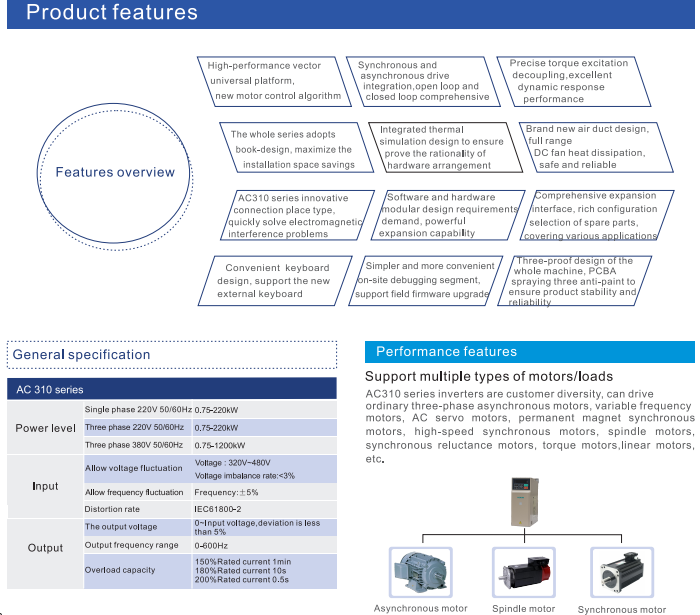High-performance vector general platform & brand-new motor control algorithm; Integrated PSAM & AM drive & comprehensive open-loop and closed-loop; Book design saves installation space; Up-down straight air-duct design & DC fan cooling;