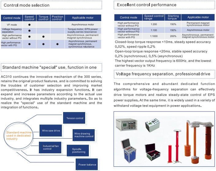 AC310-XL special frequency converter for cable industry is a product continuously developed on the high-performance vector technology platform of VEICHI. It adopts field-oriented vector control technology, compatible with asynchronous and synchronous motor control. Moreover, under the premise of high performance and high reliability, the components are arranged reasonably to realize the book-style narrow body design. The design has strengthened customer ease of use and industry professionalism, and is equipped with a wealth of expansion interfaces.