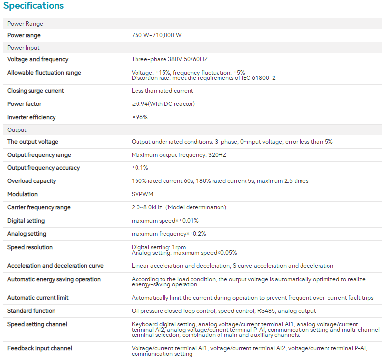 Using high-performance vector control technology, low-frequency torque is large, load response is fast, open loop 0.5Hz 150% torque output. Closed loop 0Hz200% torque output.