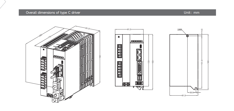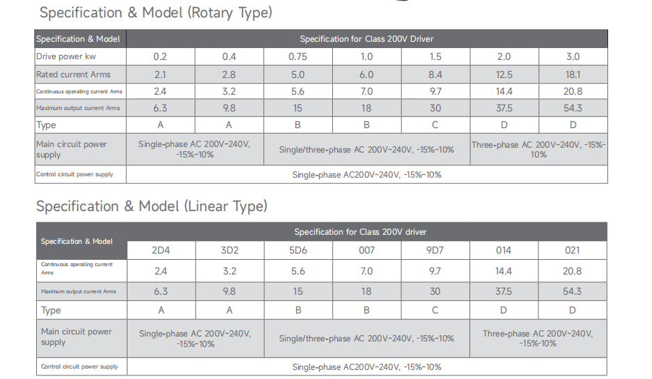 The product series is divided into A series (high-performance general-purpose) & C series (economic), the communication mode mainly has pulse type and ETHERCAT bus type: Specificaion(Rotary Type):0.2kw-3.0kw 2.1A-18.1A Specificaion(Linear Type)2.4A-20.8A