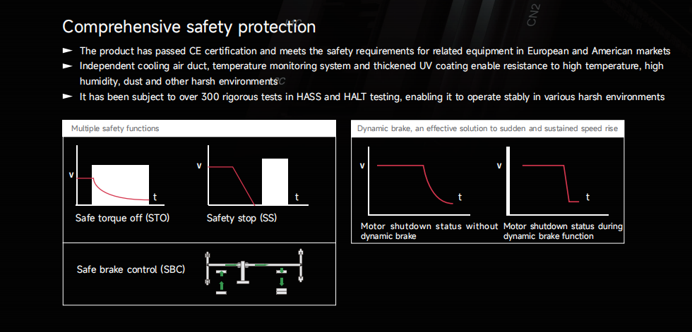 8、Multiple safety functions, safety torque off STO, safety emergency stop SS, safety brake SBC, dynamic braking, effectively solve the flying car;