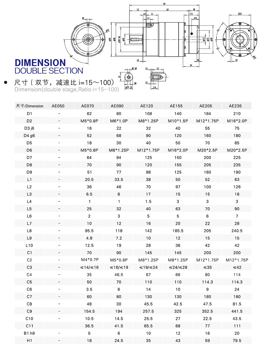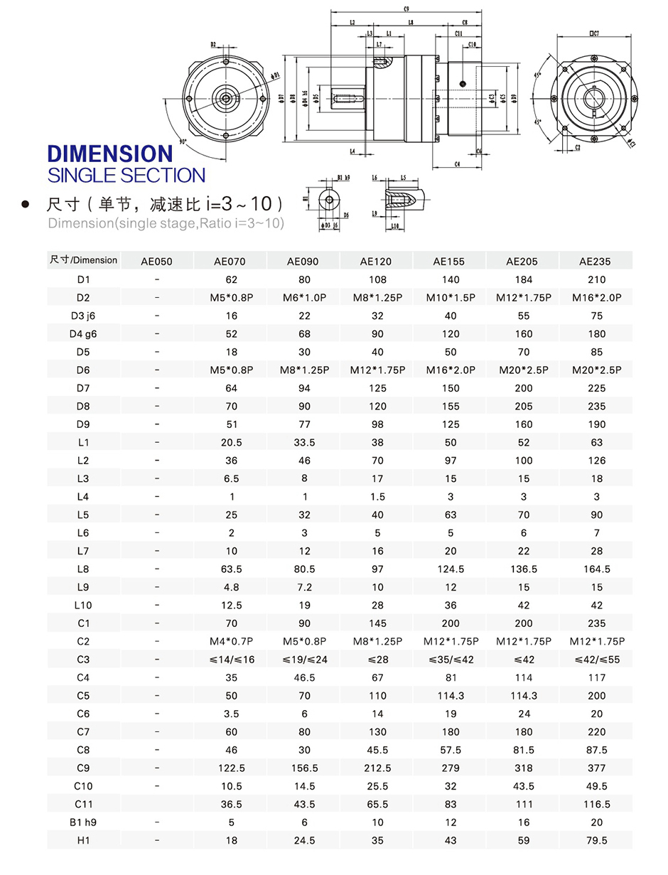 Flange dimensions :AE050 & AE070 & AE090 & AE120 & AE155 & AE205 & AE235