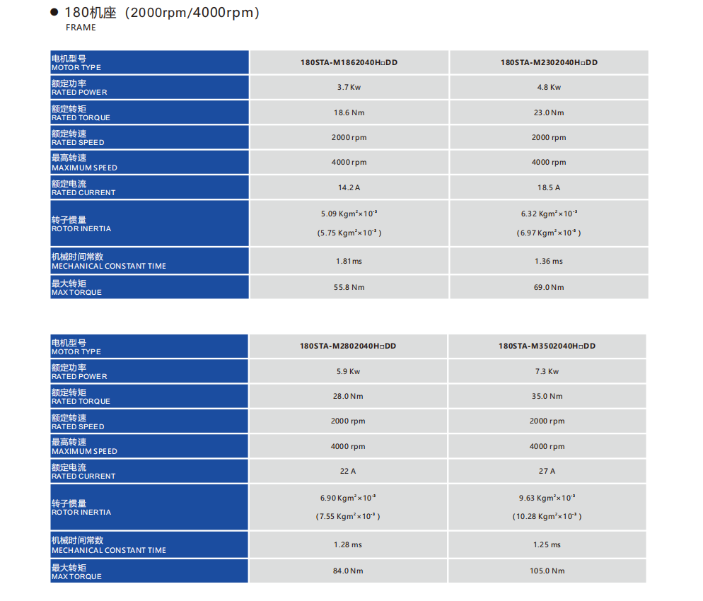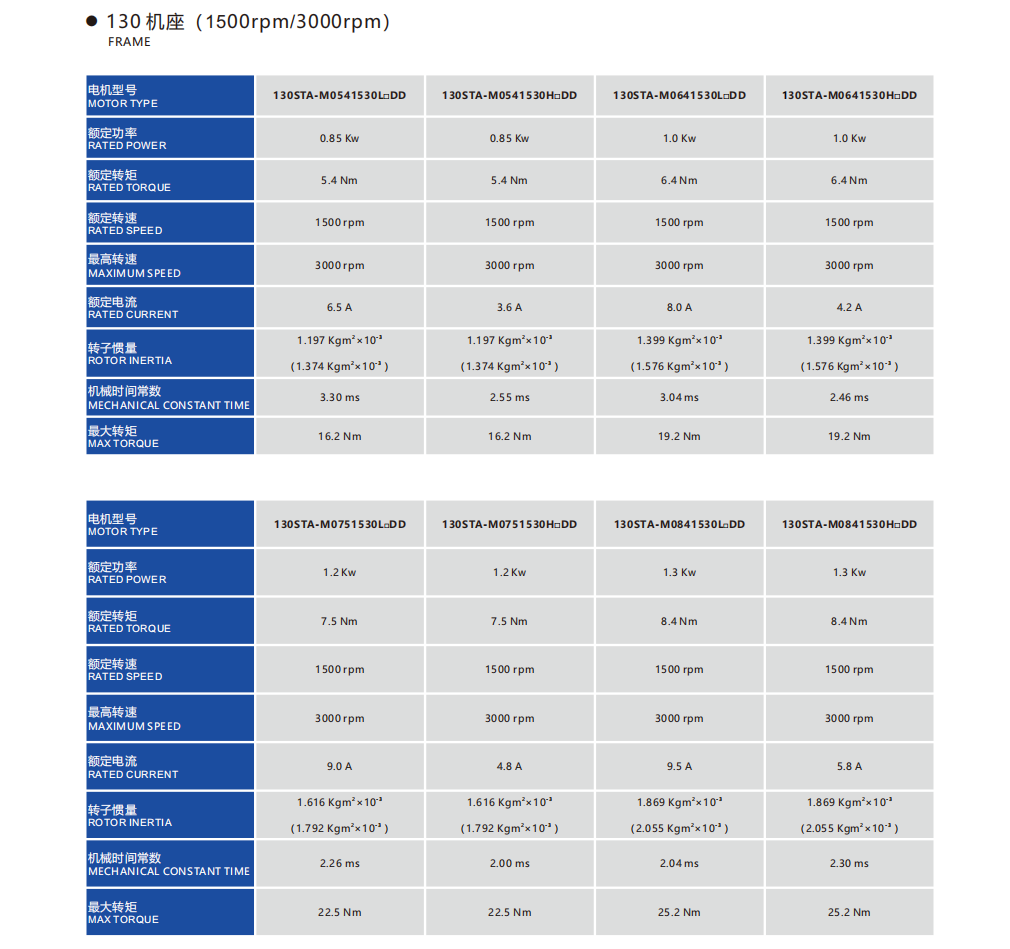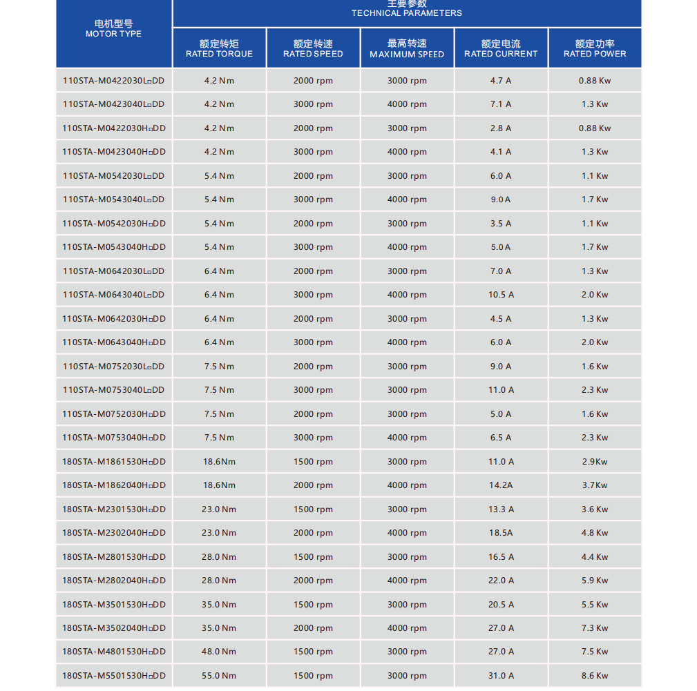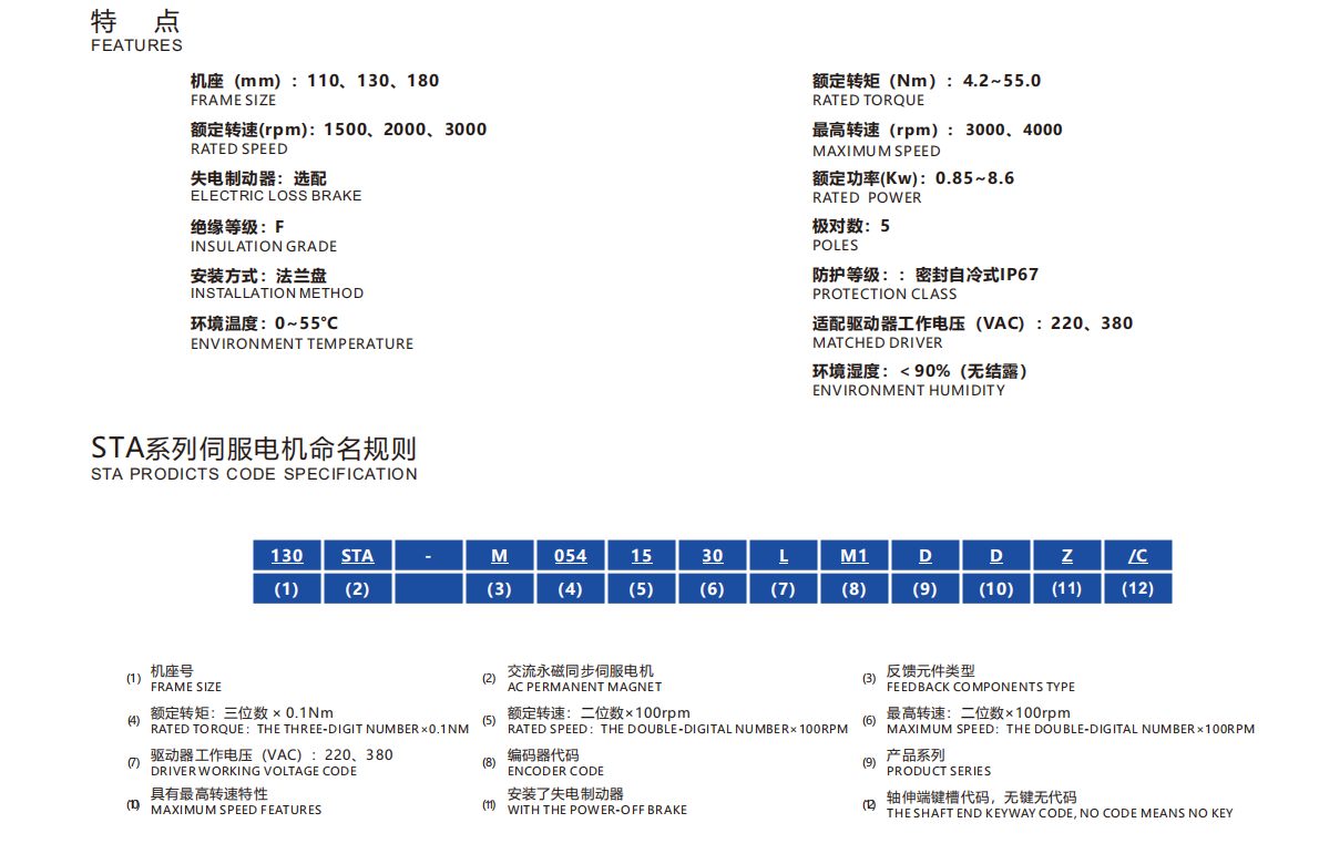 Frame Sizes: 110STA, 130STA, 180STA 4.2-55Nm 0.85-8.6kw Rated speed:1500/2000/3000rpm,Max speed:3000/4000rpm
