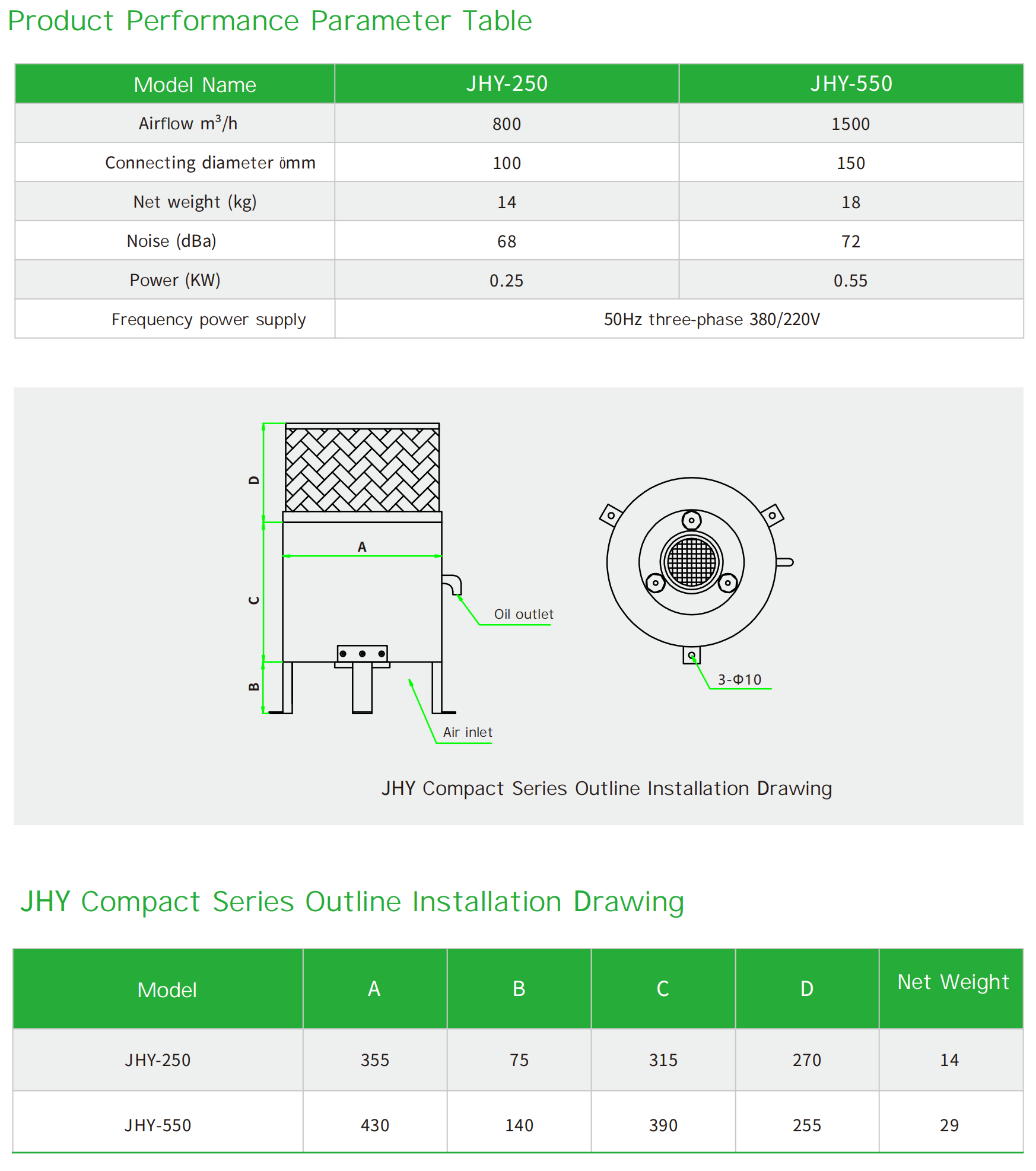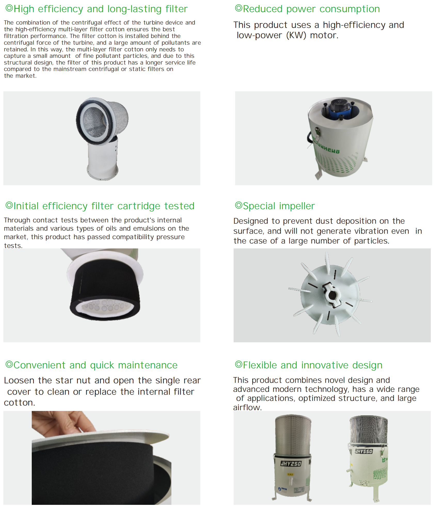 The oil mist collector is specially designed for various machining watermist, smoke, and oil mist problems. JHY is committed to developing oilmist collectors with different performance. Currently, the productsare divided into centrifugal, electrostatic, and condensation types, andprovide both single-machine and centralized solutions to meet thedifferent needs of customers.