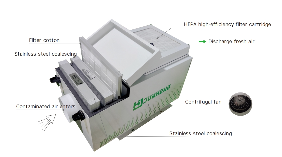 The JHY series small oil mist collectors can handle airflow of 750-3200 m³/h and collect and purify various oil mist, water mist, and fumes generated by single machine tools.
