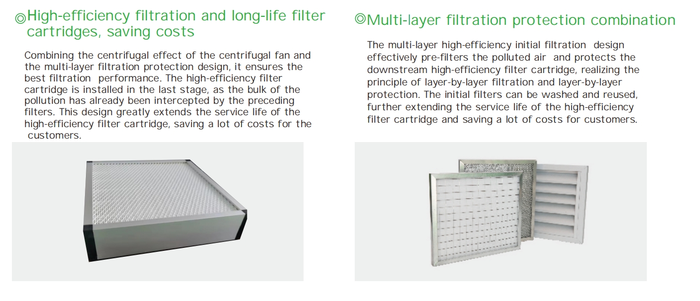*The HEPA high-efficiency filter cartridge filters out extremely small particles of 0.2-0.5 μm in the air, achieving a filtration efficiency of 99.95%.