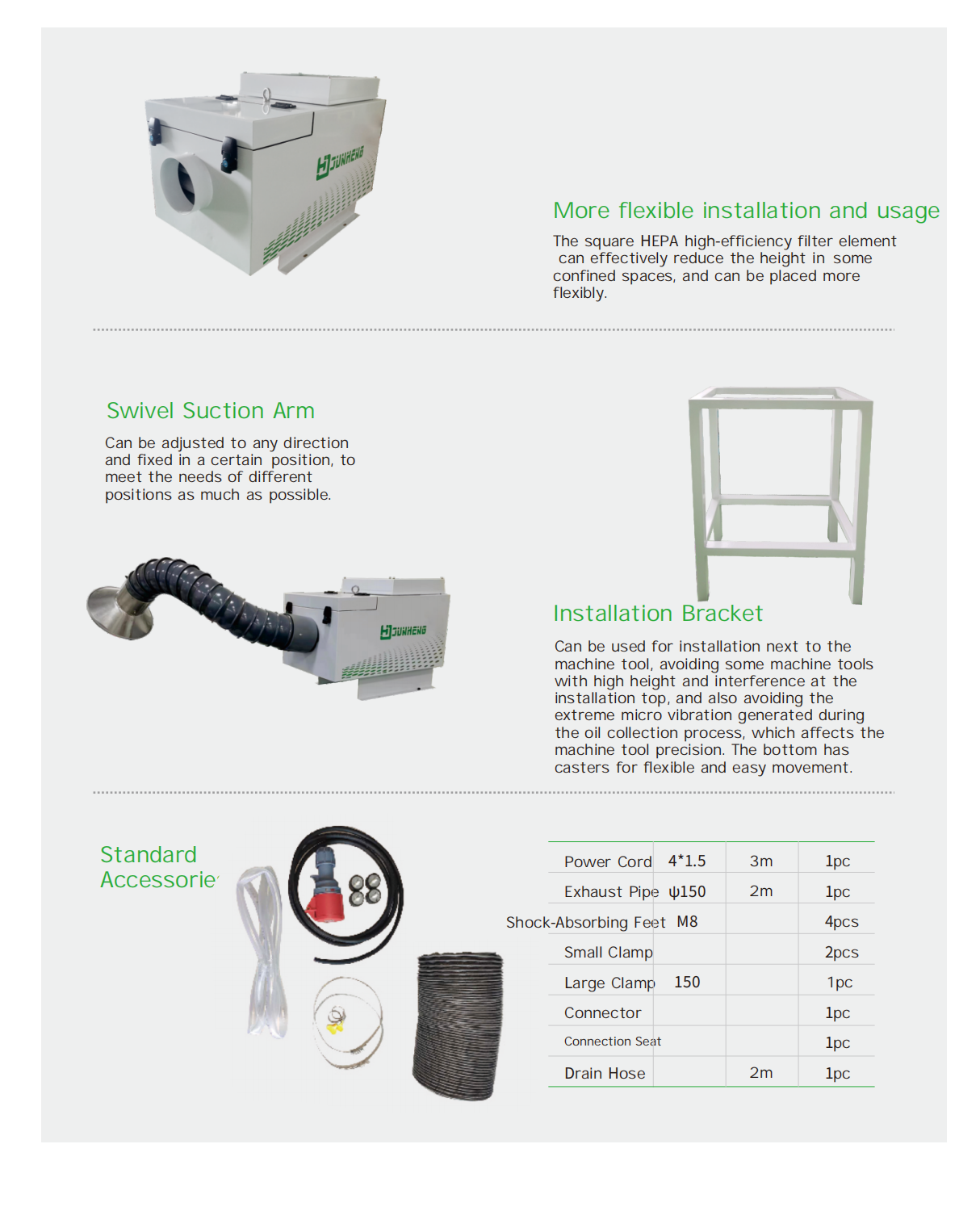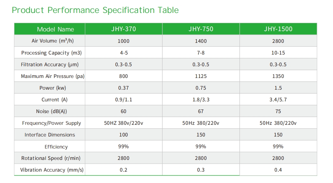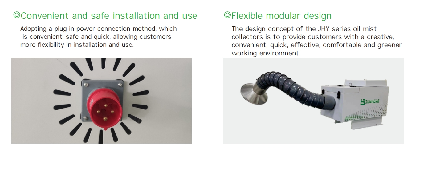 *The JHY series small oil mist collectors can handle airflow of 750-3200 m³/h, which can collect and purify various oil mist, water mist, and fumes generated by single machine tools. And JHY370 series oil mist collector is suitable for CNC machining centers, bearing grinders, NC drilling and tapping centers, griers and other mechanical processing with cutting fluid or lubricant. The appearance is more compact, which is more conducive to quick installation and use.