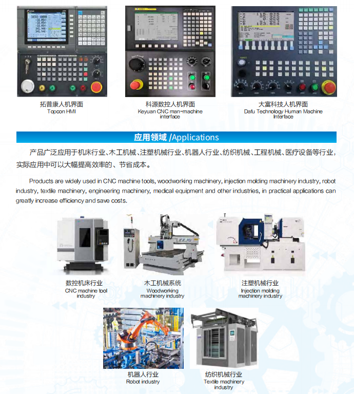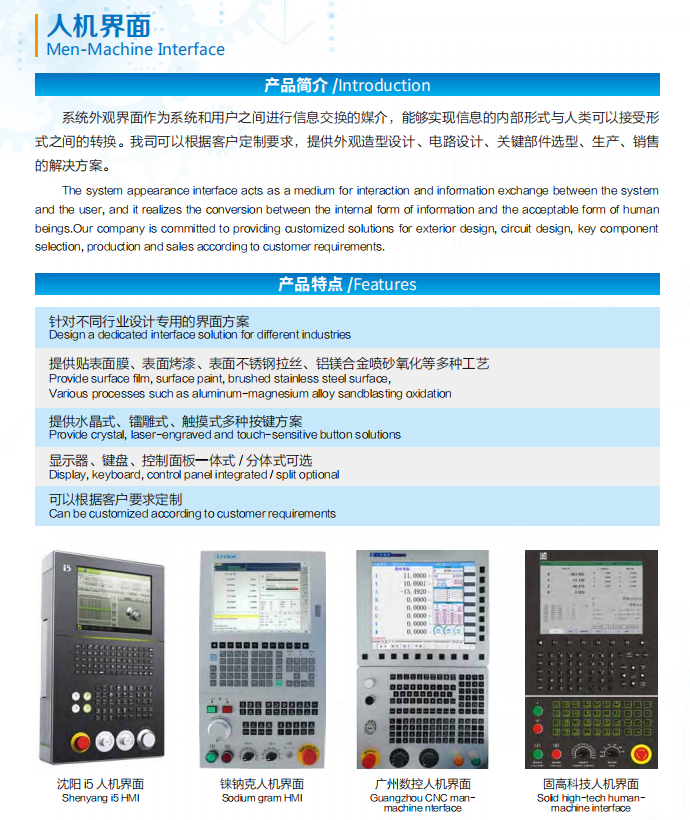 Man-machine interface is a digital product that provides communication between operators and automation equipment. Provide customized control panel development for imported CNC system. Diversified communication ports meet the communication modes of different systems.