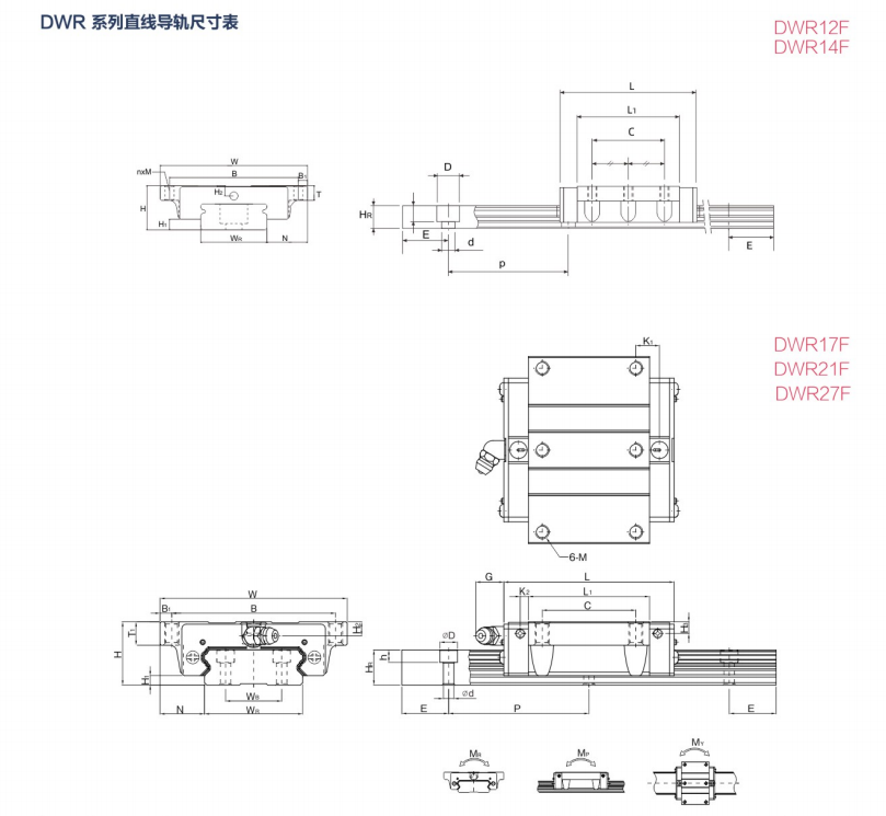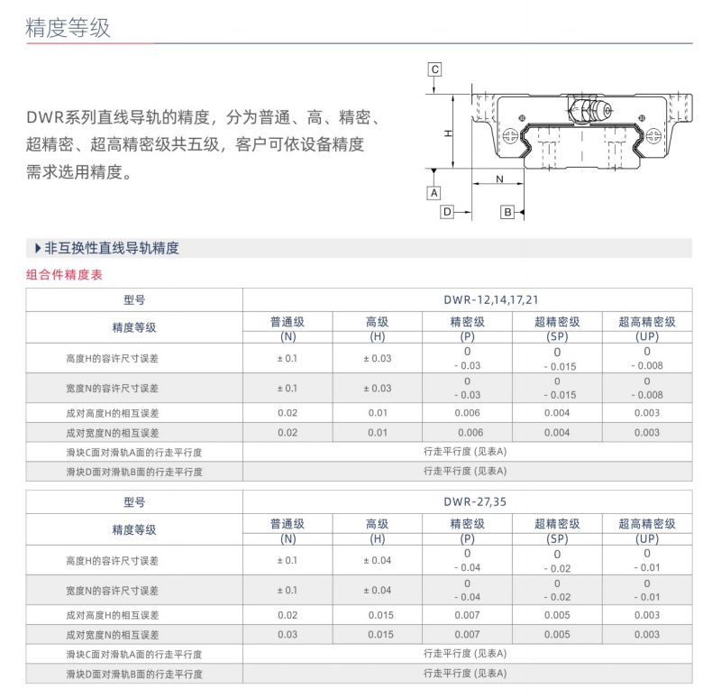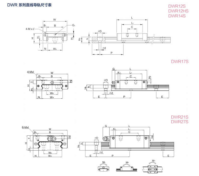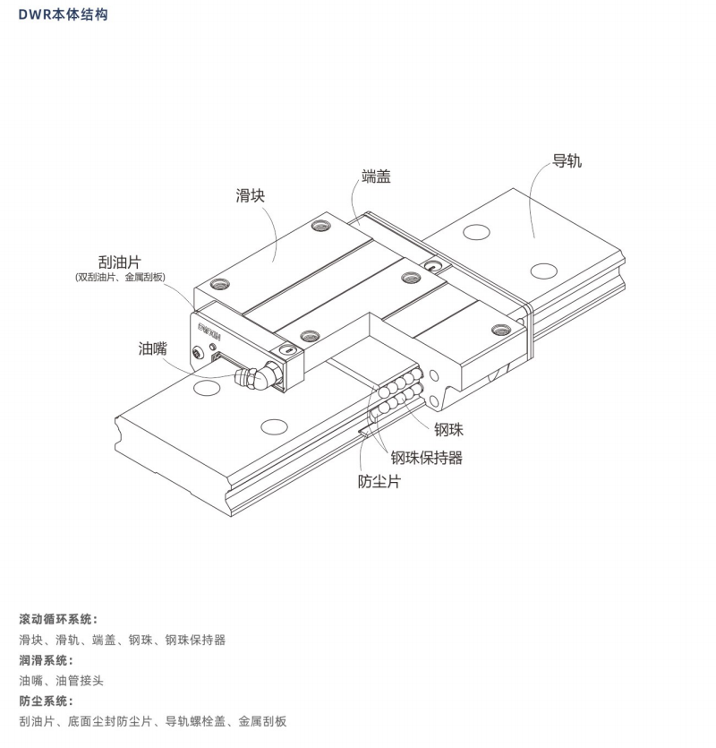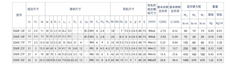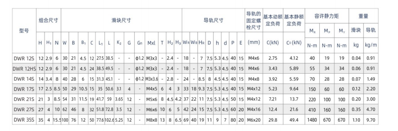 DWR Series Linear Guide Features With a 45° contact angle design, this guide offers equal load capacity in all four directions and self-aligning capability, effectively compensating for mounting surface inaccuracies to achieve high precision requirements. Furthermore, the increased rail width and re