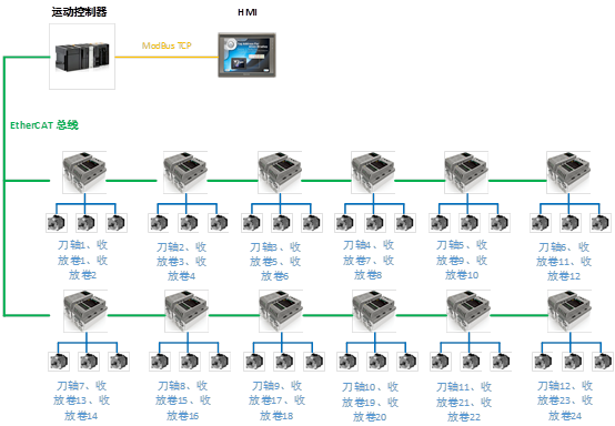 The scheme configuration is shown in the figure above (the number of stations can be increased or decreased freely according to the customer’s demand). According to the ratio of cutter shaft and retraction reel 1:2, Ωm-N1 selects three axes in one, and one servo corresponds to one cutter shaft and two retraction and retraction reels. The maximum speed of synchronous cutting is 60m / min, the synchronous deviation of cutter shaft is within 0.01mm, and the machining accuracy is ± 0.05mm. The scanning period of the probe is 125 us, which ensures that the tool axis position can be accurately compensated during high-speed operation.