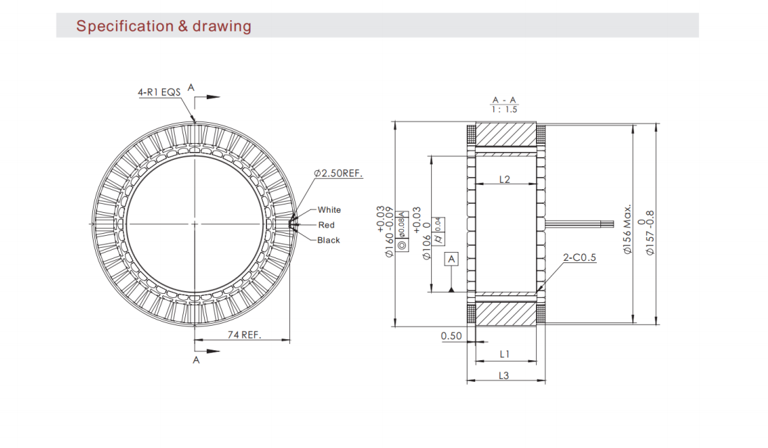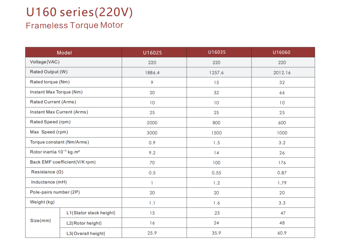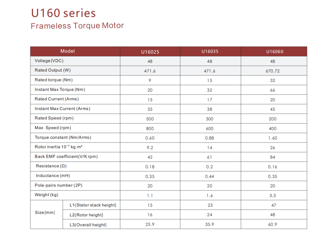 U160 series Large Hollow Shaft Frameless Direct‑Drive Motor, Outer diameter:160mm, Inner diameter:106mm Rated torque :9-32Nm, Motor height:25.9-60.9mm