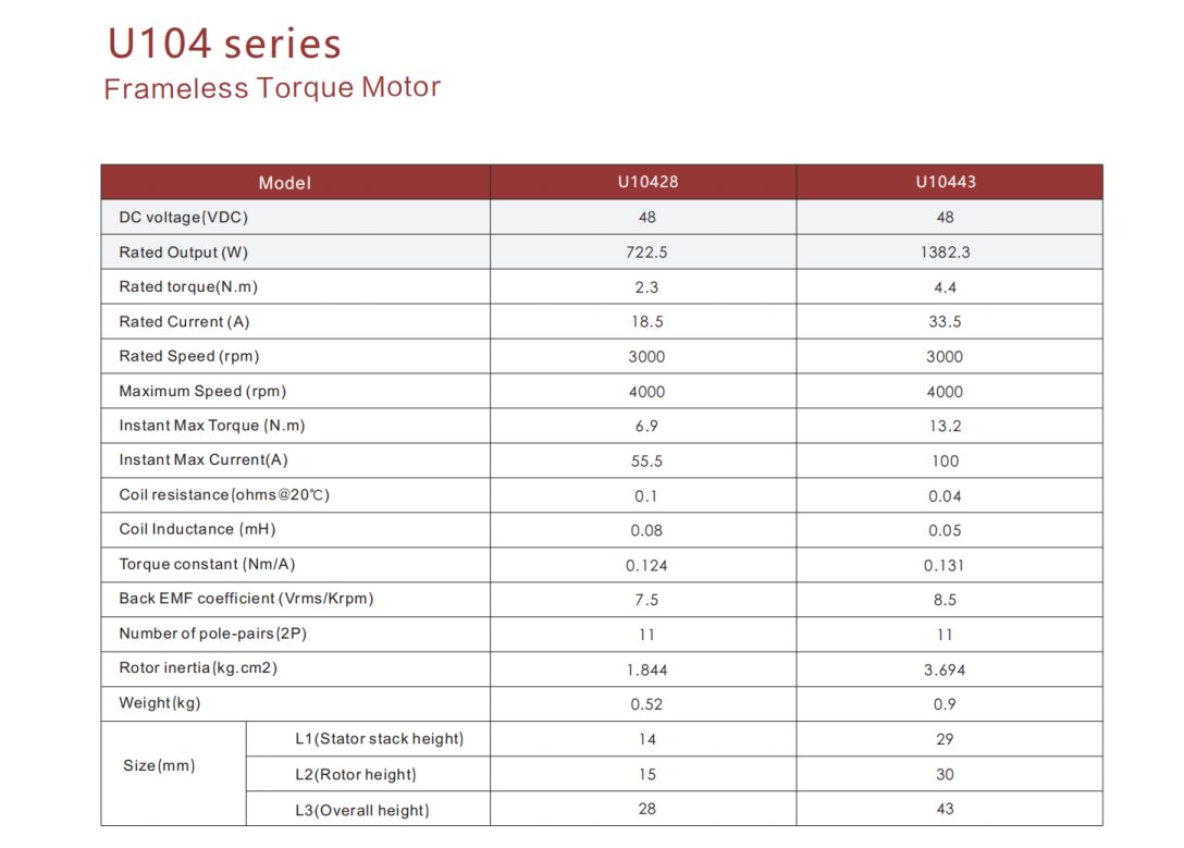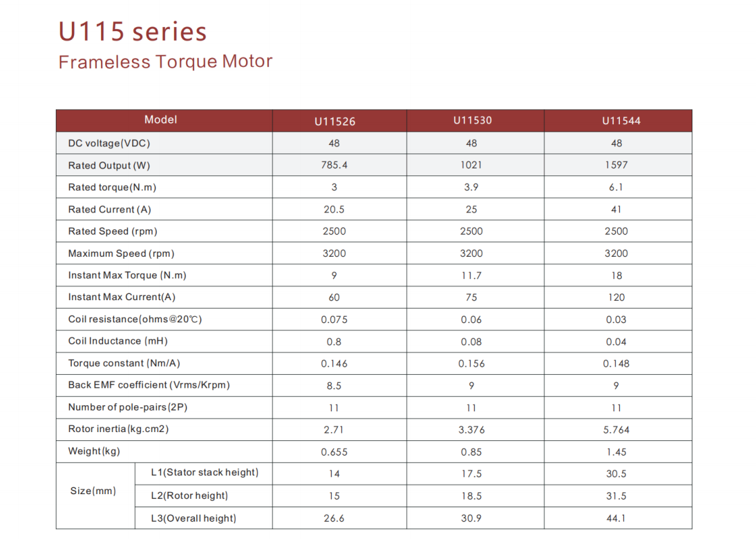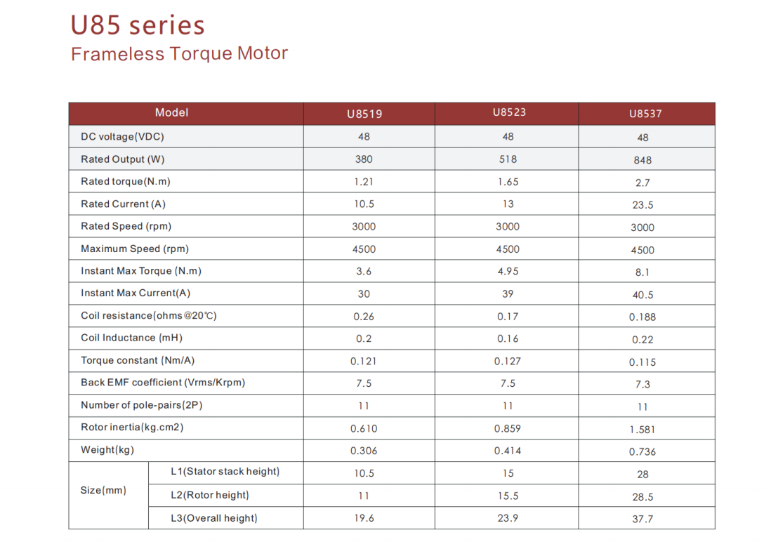 U85 U94 U104 U115 series frameless motors, Outer diameter:84mm/94mm/104/115mm, Inner diameter:52mm/57mm/73mm/74 Rated torque :1.21-6.1Nm, Motor height:18.3-44.4mm