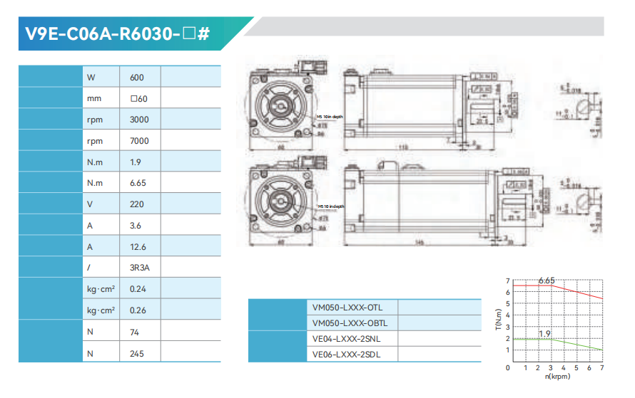 High-speed and ultra-low inertia :60-80Flange 0.2-1.0kw 0.64~3.2N.m 3000~7000rpm High-speedlow inertia: 40-130Flange 0.1-5kw 0.32~15.9N.m Rated speed: 3000rpm Max.speed:5000/6000/7000rpm Medium-speedmedium-inertia:110-180Flange 1.2-7.5kw 4.8~35.8N.m Rated speed:2000/3000rpm Max.speed:4000/5000rpm