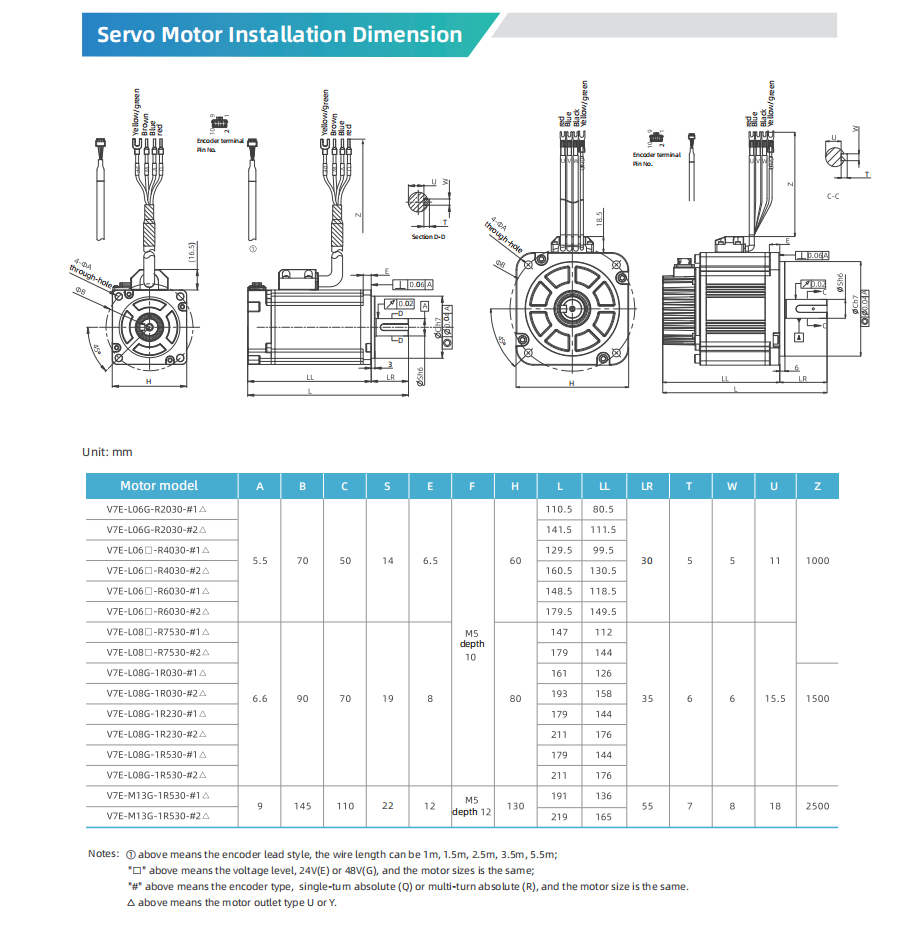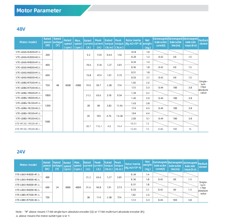 Standard 17bit absolute encoder, optional 23bit and 24bit serial communication encoder.