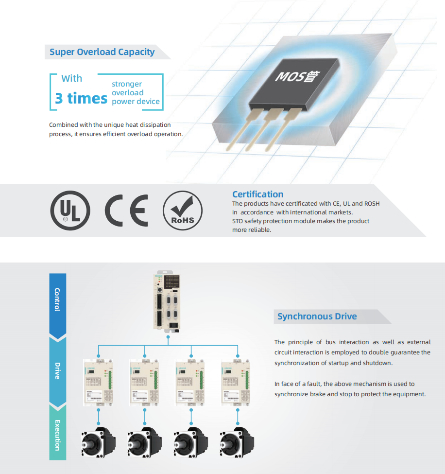 The products are designed in accordance with CE and ROSH standards to connect with international markets. Equipped with STO safety protection module to make the product more reliable.