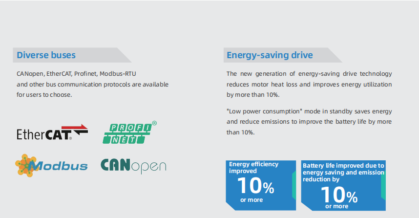 Support CANopen, EtherCAT, Profinet, Modbus-RTU and other bus communication protocols to enrich the user's choice.