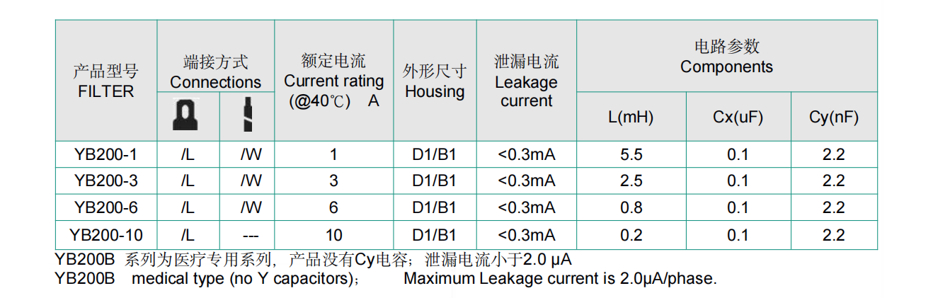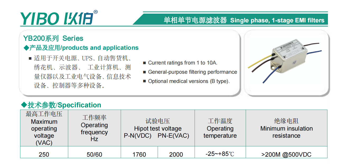 YB200 series AC single-phase single stage universal filter (This series of products can all provide terminal block wiring methods) Rated voltage: 220-250VAC Rated current: 1-10A (optional) Multiple connection methods such as leads, solder p Rated current: 1~300A optional