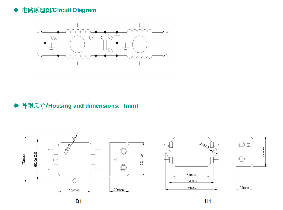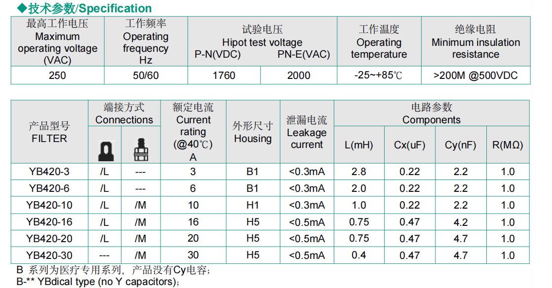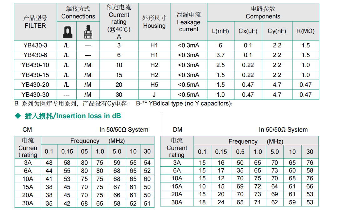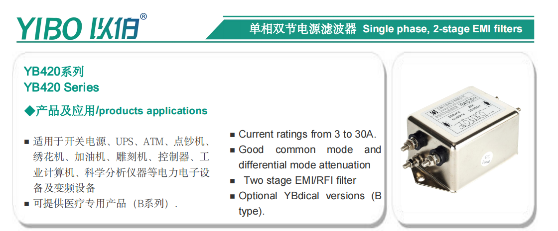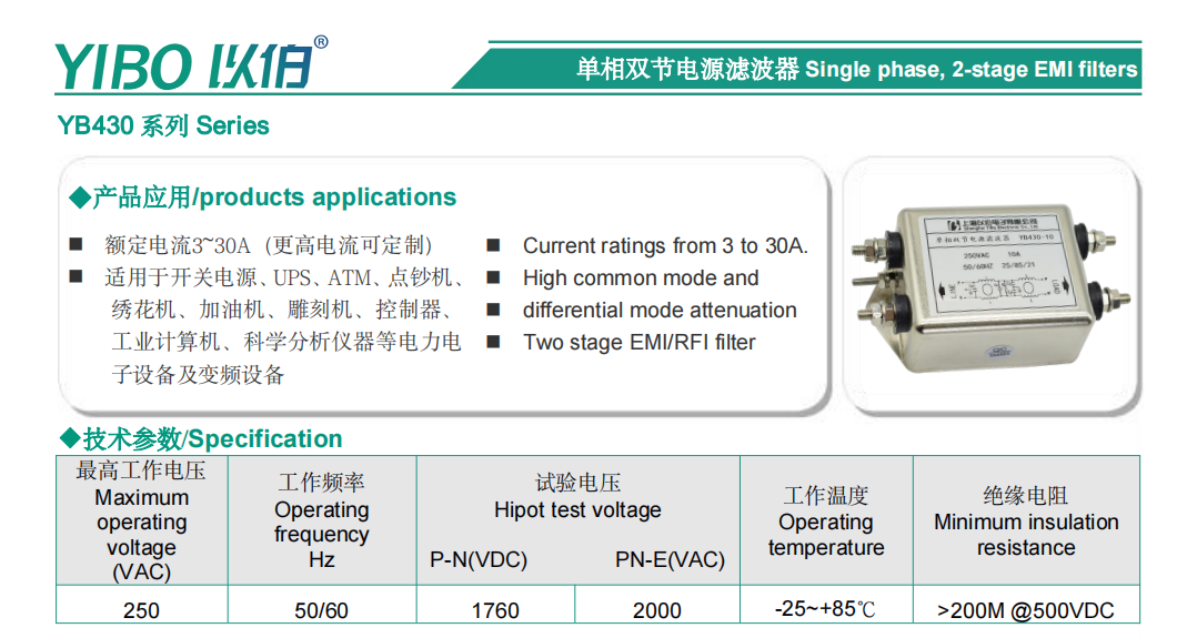 Rated voltage: 250VAC YB420 rated voltage: 3-30A optional YB430 rated voltage: 3-30A optional Product advantages: High performance filter, dual section filter, good mid to high frequency performance.